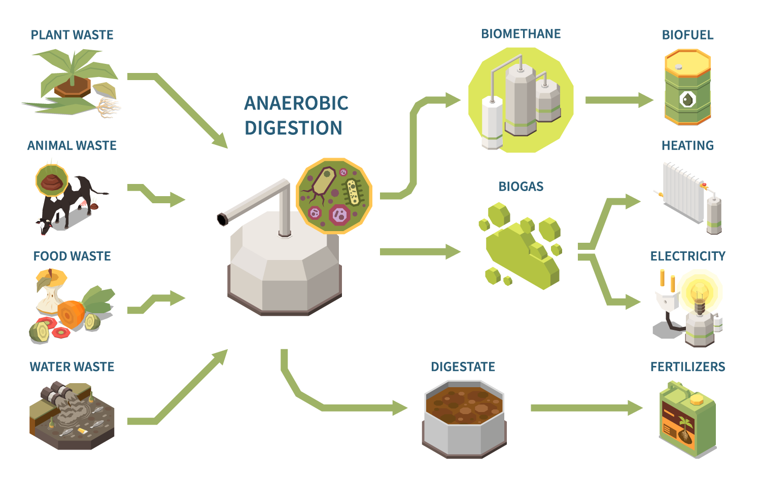During the anaerobic digestion process used to produce biogas, the organic waste undergoes decomposition by microorganisms. As a result, nutrient-rich digestate is generated, which can be further processed and transformed into biofertilizers.